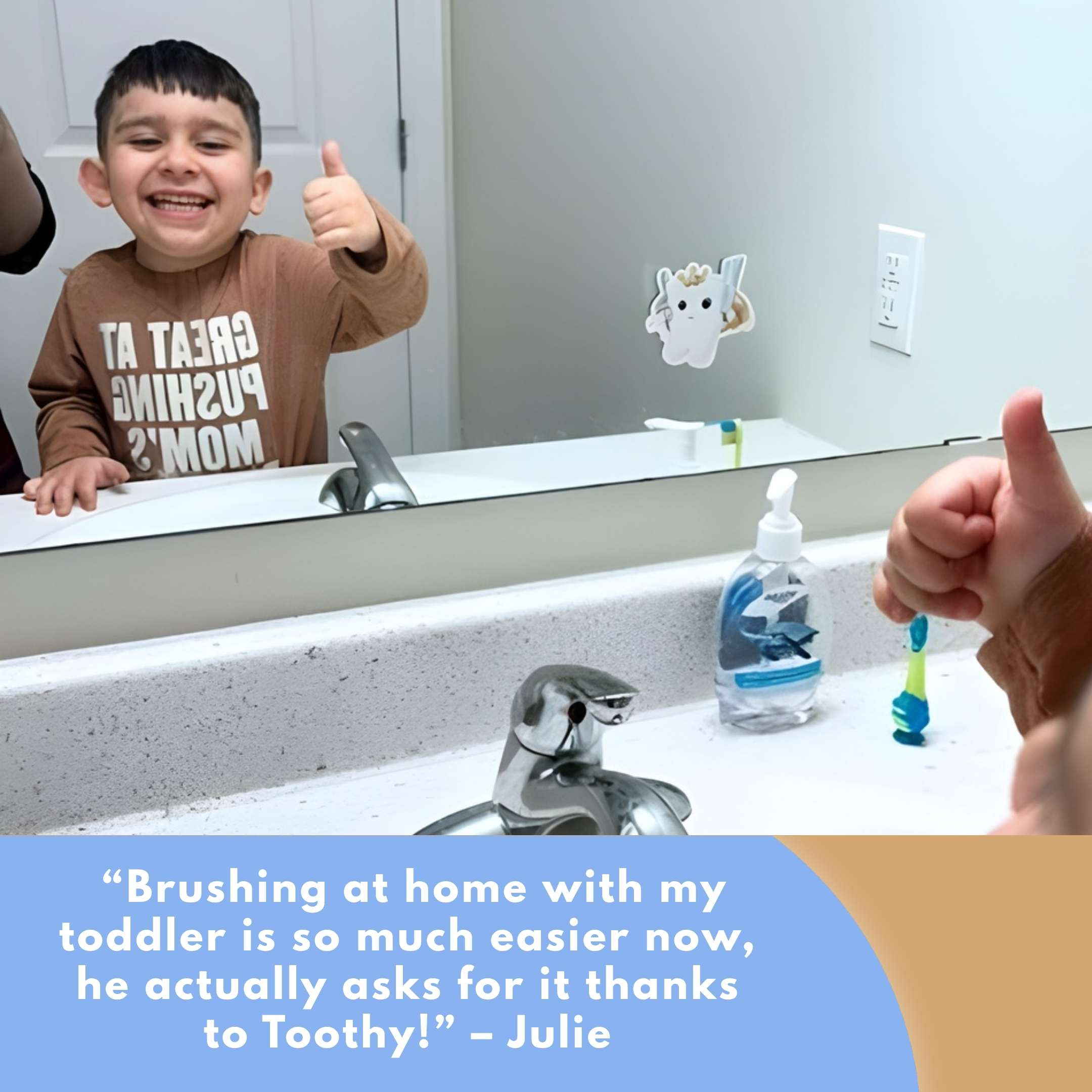 Stick me on the bathroom mirror and I’ll cheer your kiddo on every morning and night.