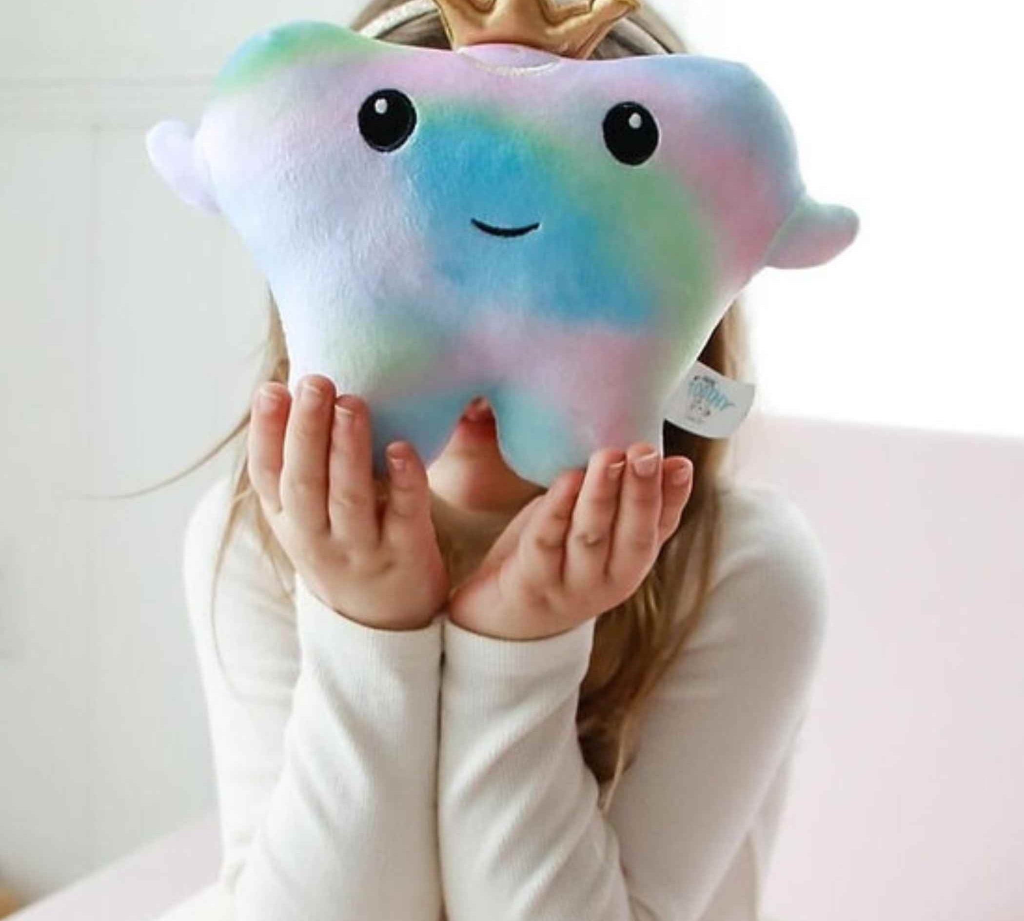 Yup, that’s me, in full multicolor plush! I’m soft, snuggly, and I’ve got a secret pocket in my wings so the Tooth Fairy can swoop in without waking anyone up.